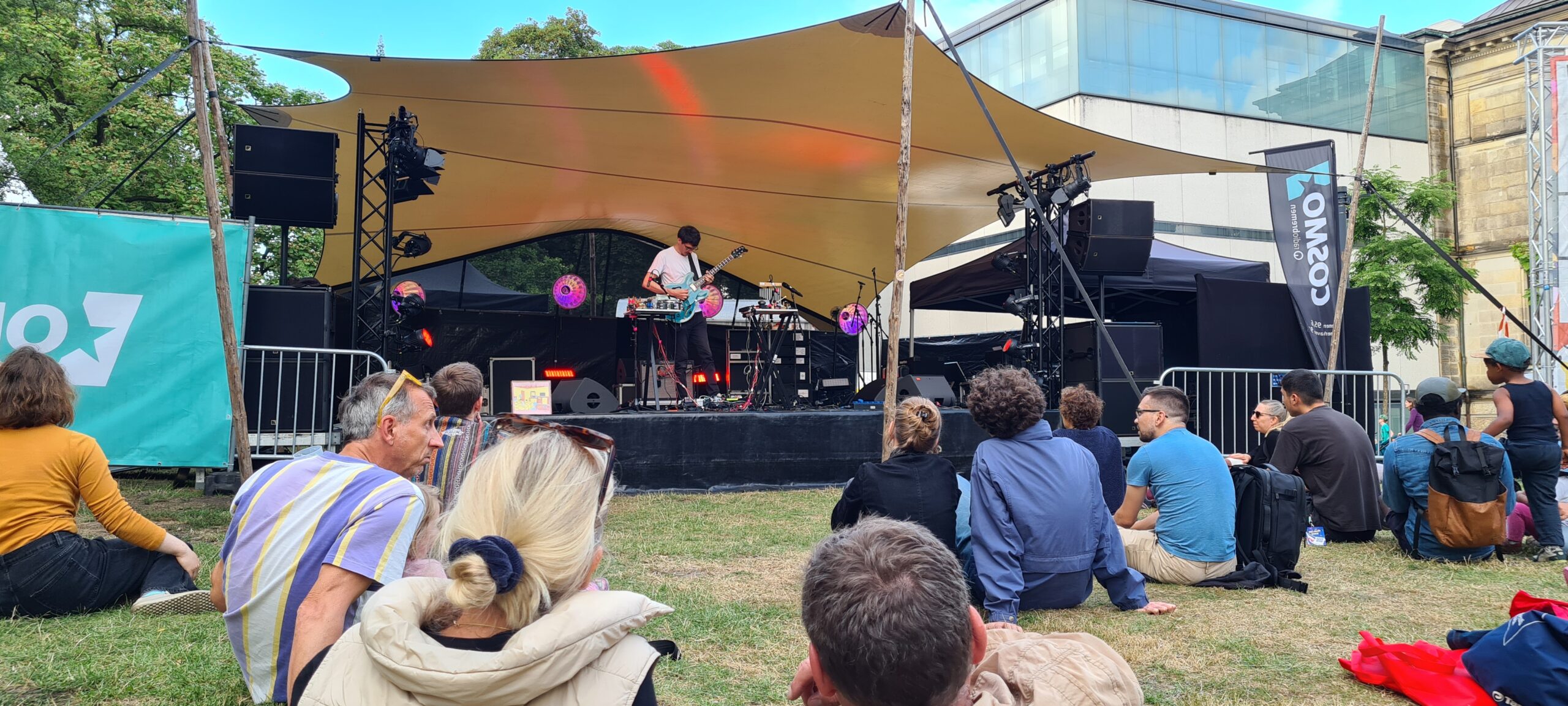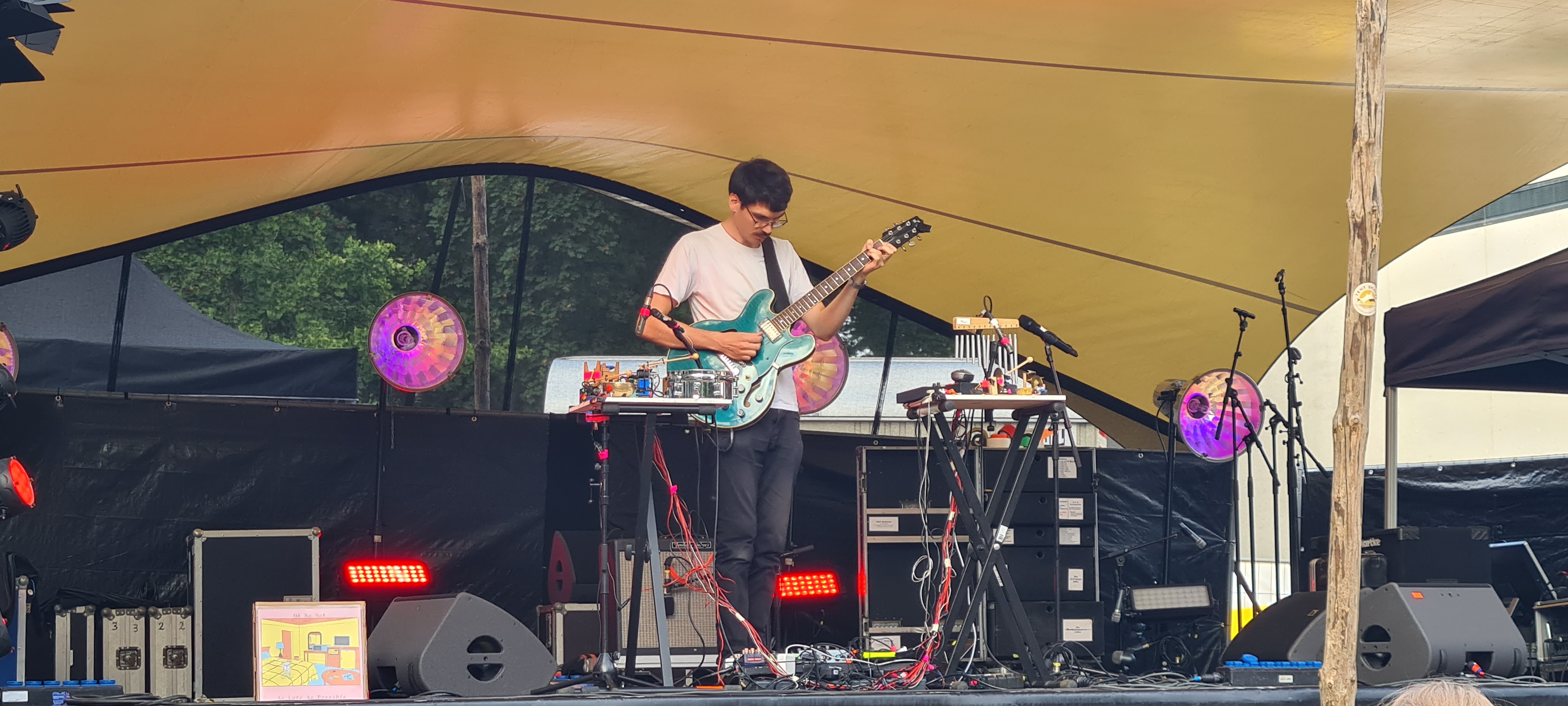Los ging es ganz entspannt an der Parkbühne bei der Kunsthalle. Der Schweizer Oh No Noh bot schönes analoges Gefrikel mit allerlei Spielzeug, E-Guitare und Loops. Die repetive, aber nicht langweilige Soundlandschaft war sehr interessant und kam gut bei dem sich vor der Bühne gemütlich flätzenden Publikum an.