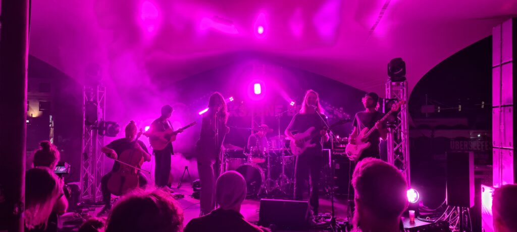 Dafür sind es die unfassbar großartigen FEATHERS AND GREED aber umso mehr. Ich erinner mich noch gut daran, wie mir ihre erste LP vor Jahren bei meinem Lieblingsplattenladen Black Plastic im Viertel ans Herz gelegt worden. Seitdem bin ich Fan und hatte mir kürzlich auch das neu erschienene zweite Werk besorgt. Aber auch diese Band hatte ich noch nie live gesehen. Was für ein Versäumnis! Eine wunderbare theatralische Bühnenshow, die an Genesis anno ’73 erinnert. Auch die Musik (mit Cello!) traumhaft. Prog- meets Art-Rock. Klug, verspielt, aufregend. Ich mag ja die Platten, aber Live mit der intensiven Bühnenshow vor allem des Sängers, ist das gleich nochmal eine ganz andere Hausnummer.